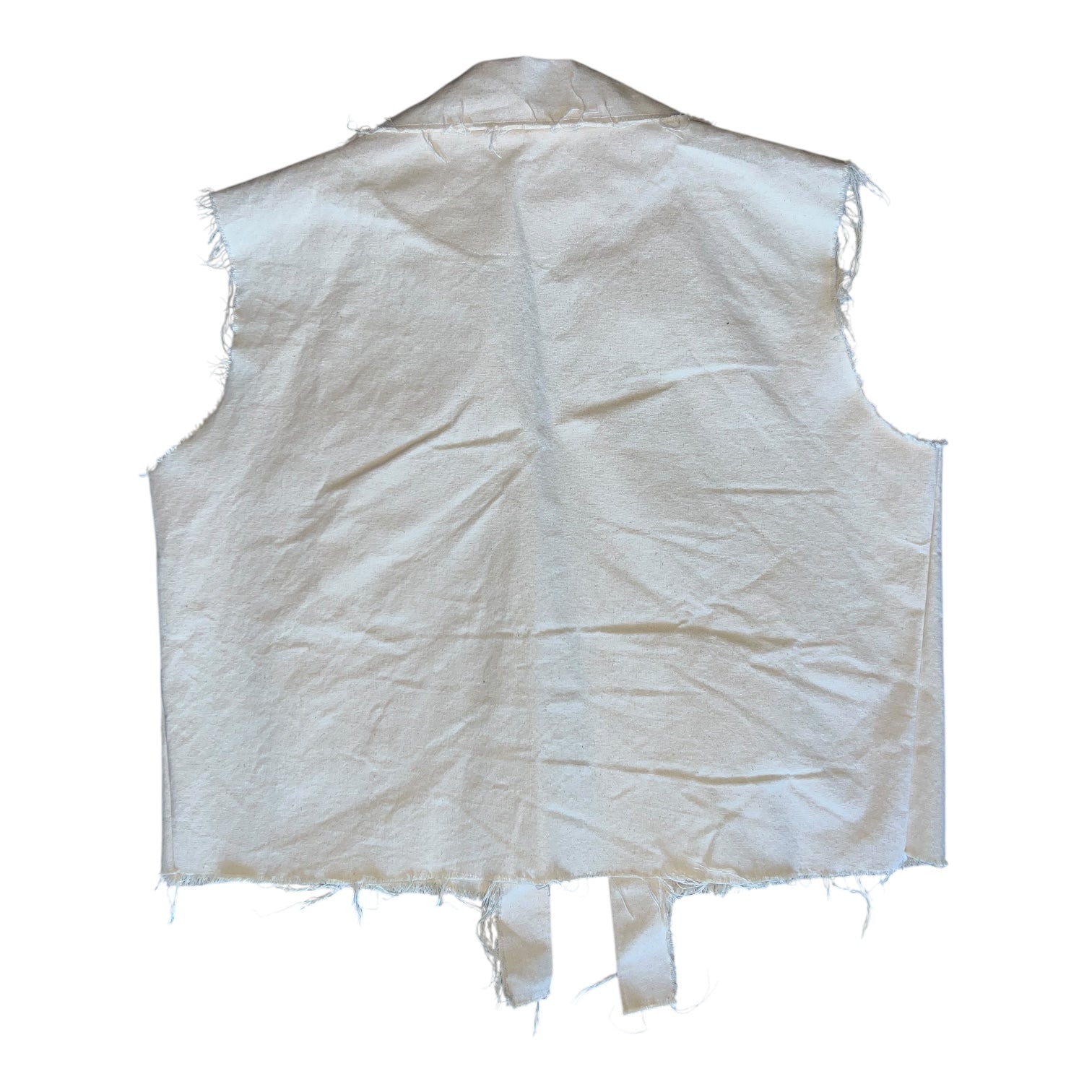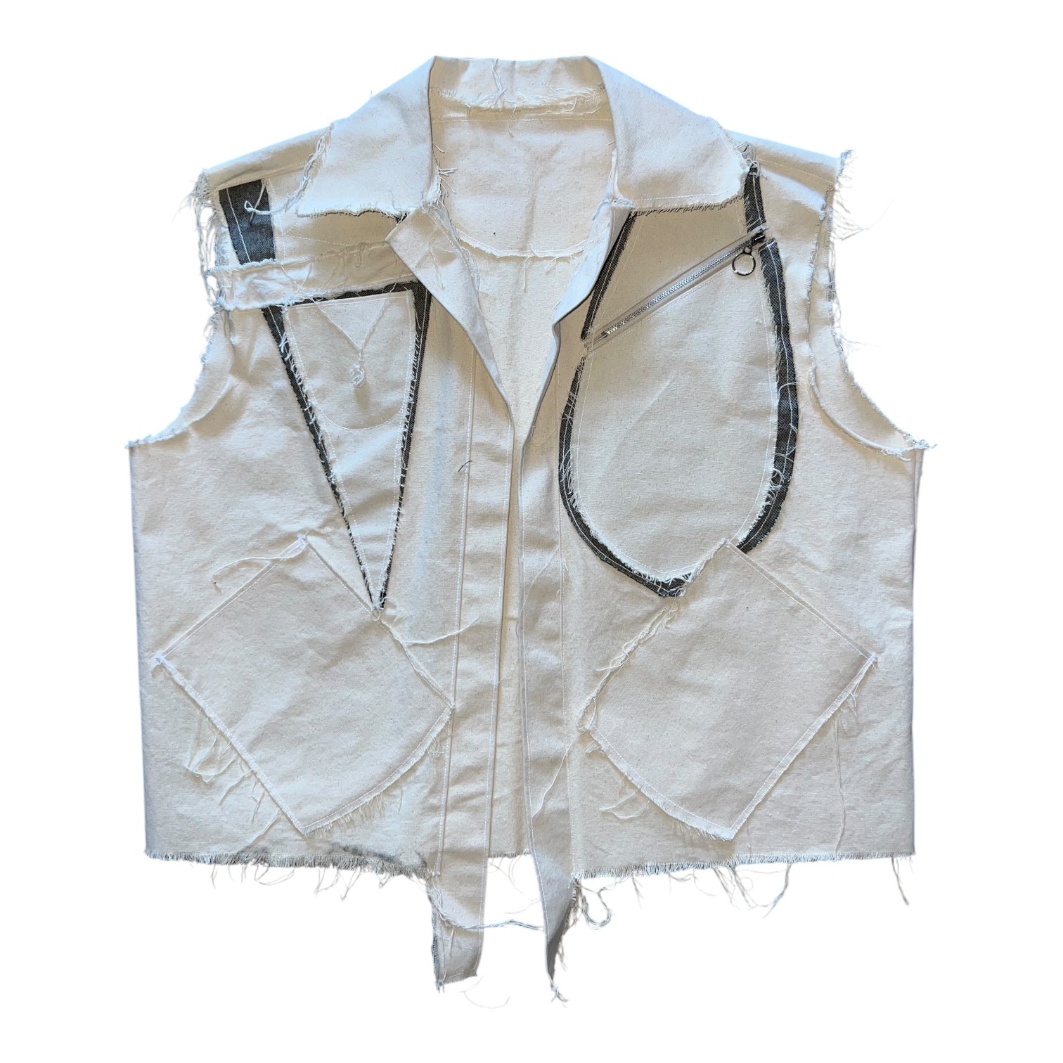 This handmade canvas and denim vest, crafted in Los Angeles, showcases a clean and simple design. Its unique pattern and quality construction offer both style and durability, making it a standout addition to any wardrobe. Perfect for those seeking a bold, artistic statement piece with expert craftsmanship.