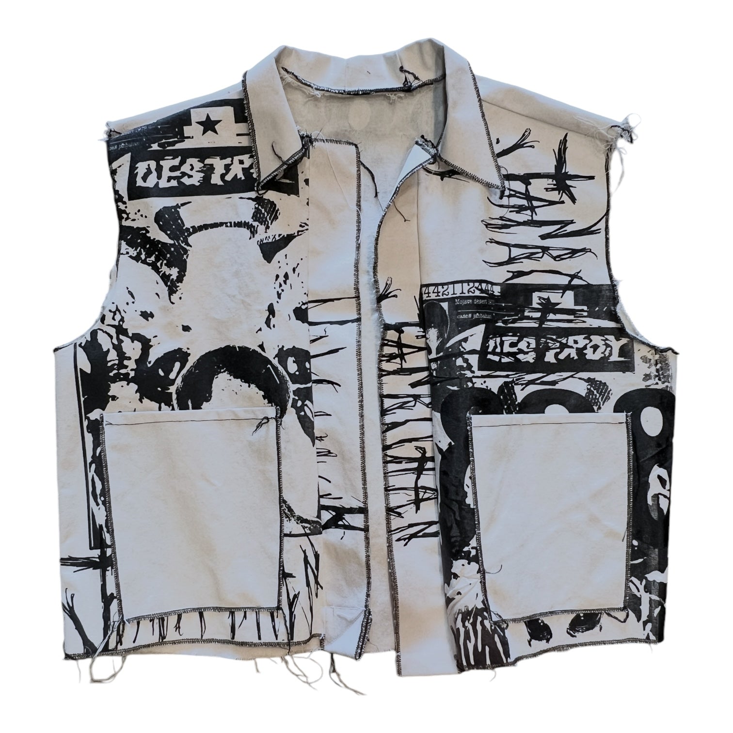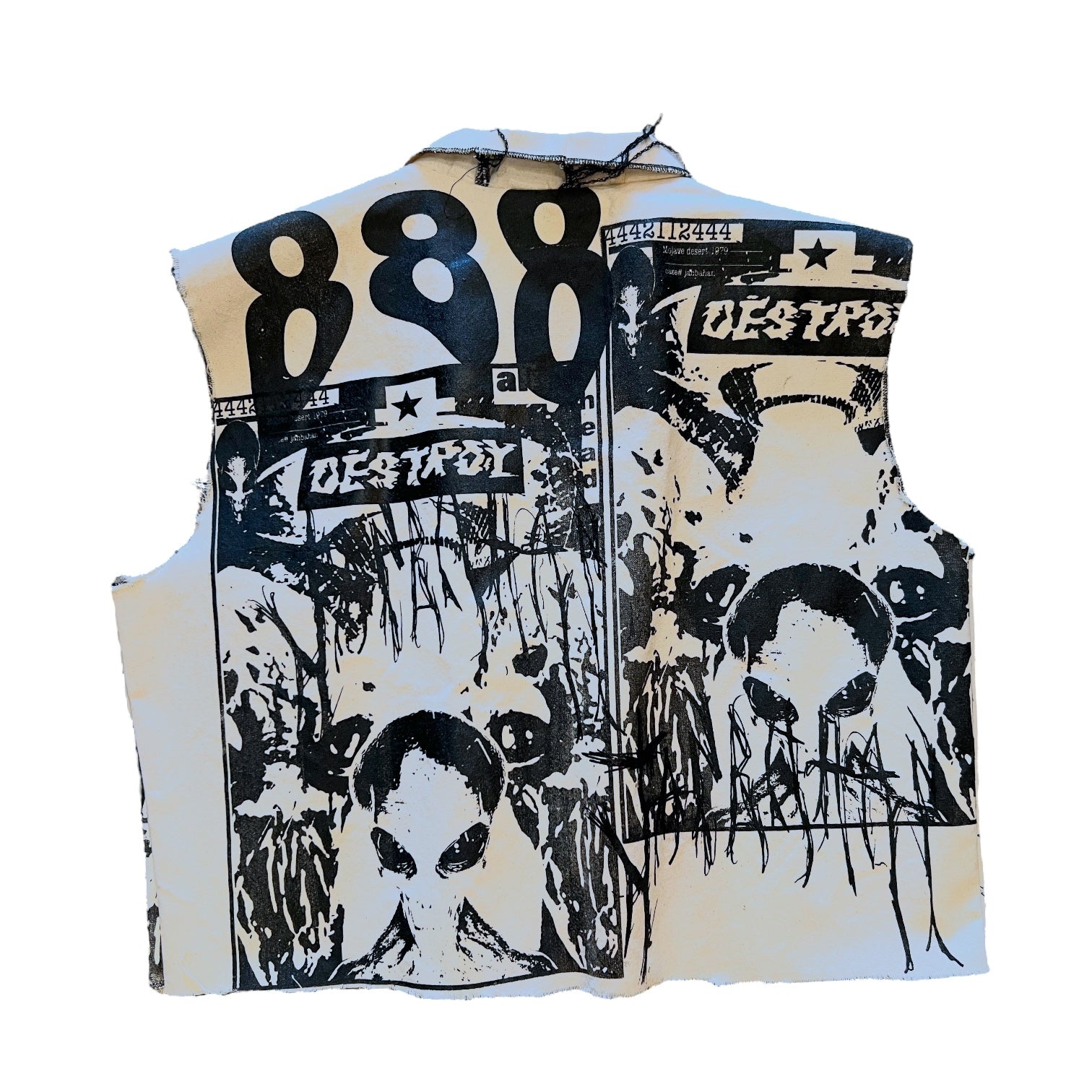 This handmade canvas vest, crafted in Los Angeles, showcases an all over print featuring a striking Alien Head design, 888, and a destroy print. Its unique pattern and quality construction offer both style and durability, making it a standout addition to any wardrobe. Perfect for those seeking a bold, artistic statement piece with expert craftsmanship.