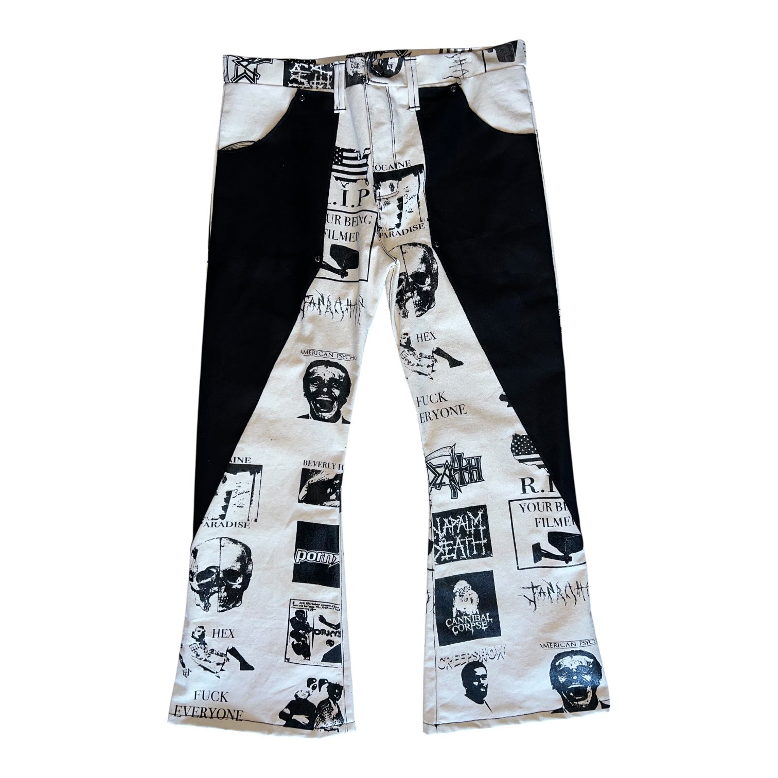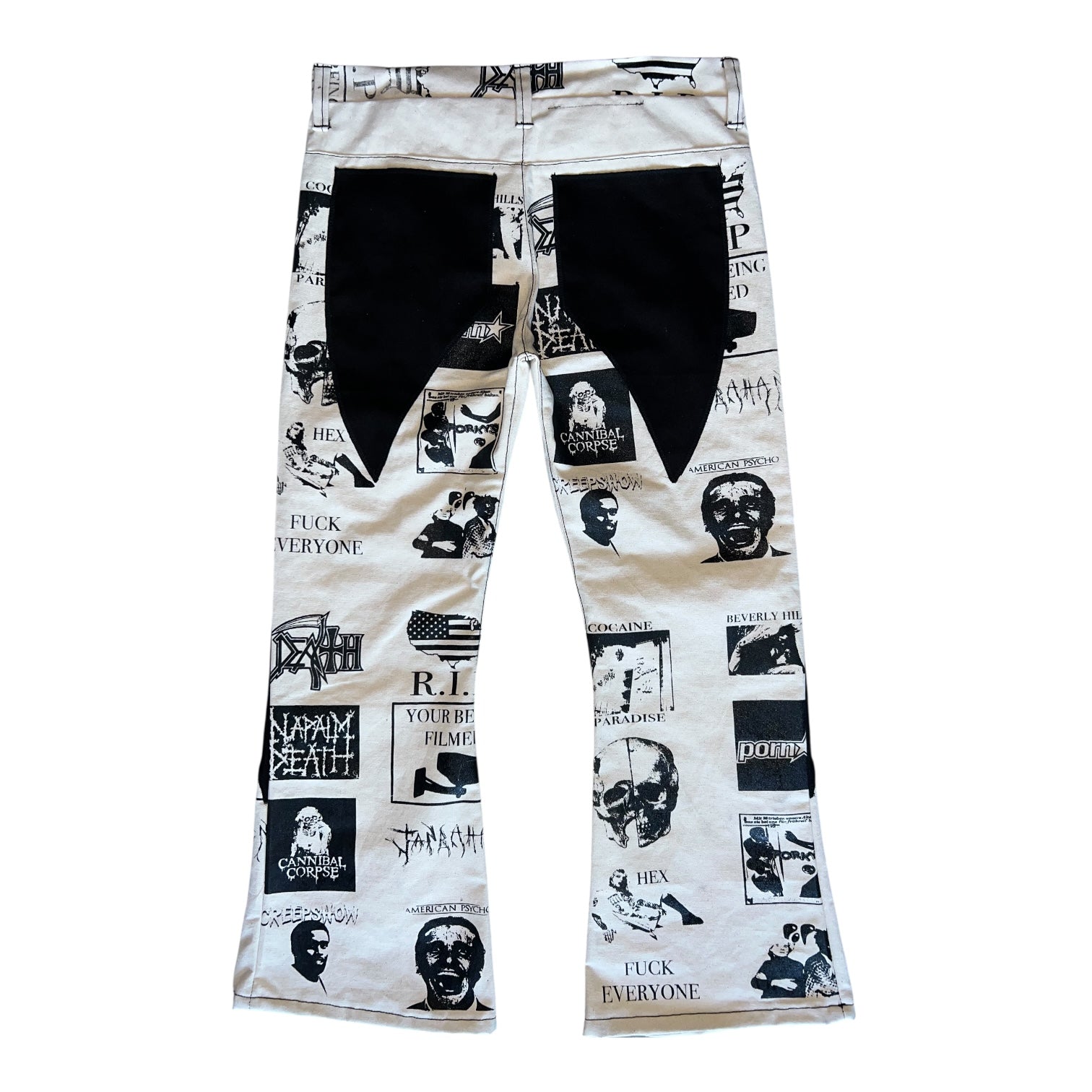 Rot in Paradise canvas pants features unique pocket design and has prints from punk bands, horror movies, and other prints. These pants are perfect for those with a keen eye for art. Made from durable canvas material, our pants also offer comfort and versatility for all-day wear.