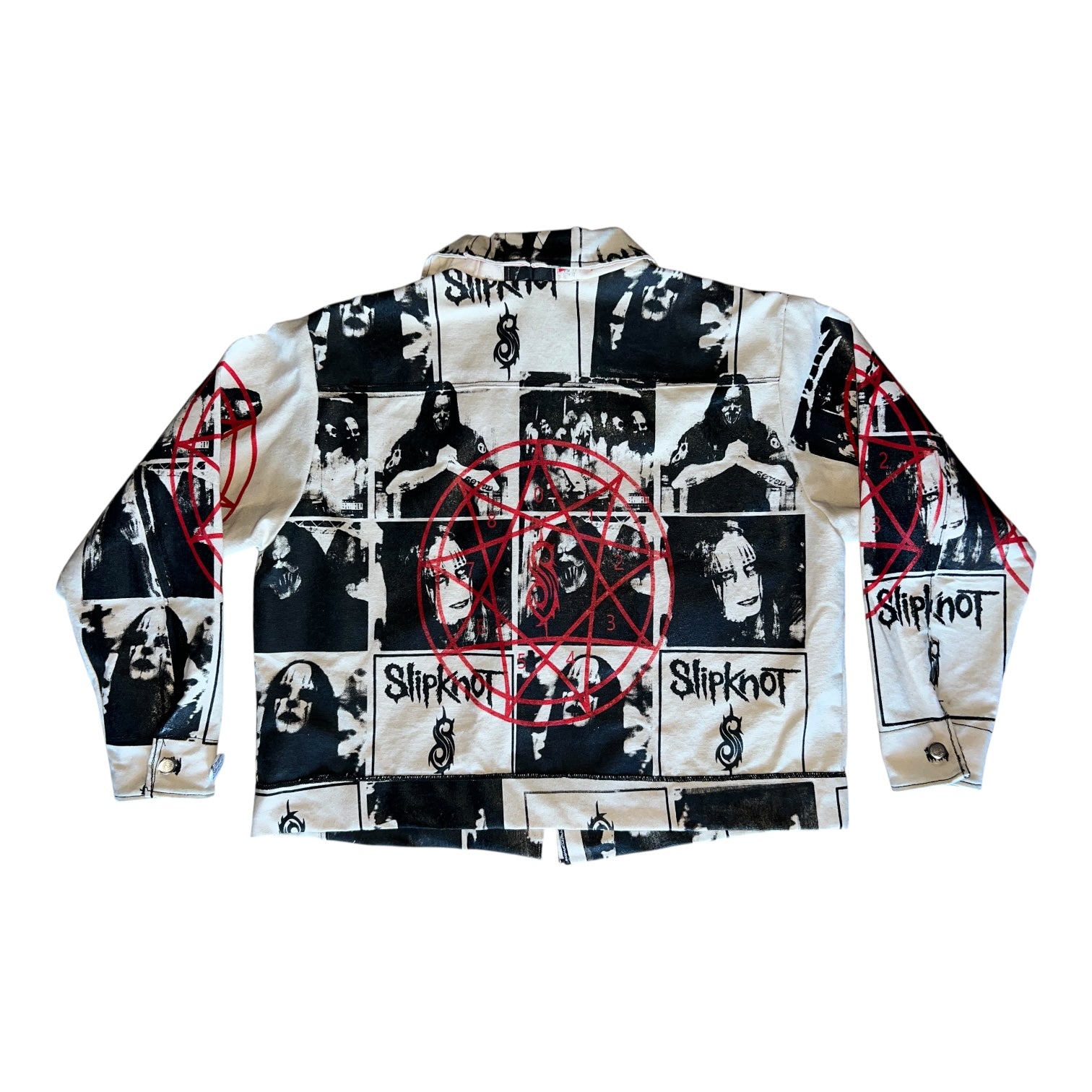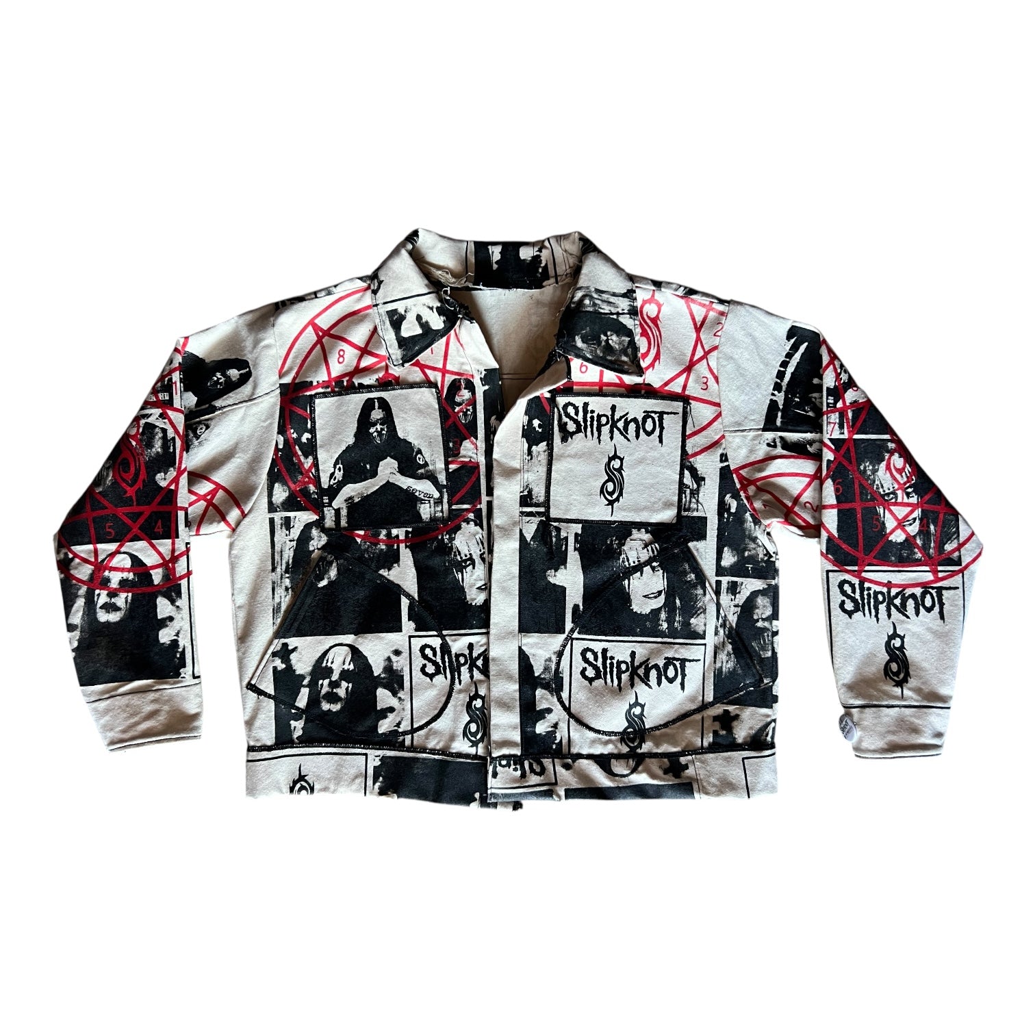 This handmade Slipknot canvas jacket, produced in Los Angeles, features a bold all-over "Slipknot" print that sets it apart as a statement piece. Crafted with attention to detail, the jacket combines sturdy raw canvas material with expert sewing techniques to ensure durability and lasting wear. Its unique design and quality construction make it a versatile outerwear choice for those seeking to express individuality through fashion. Perfectly suited for anyone appreciating handcrafted, locally made garments with an edgy, artistic flair.