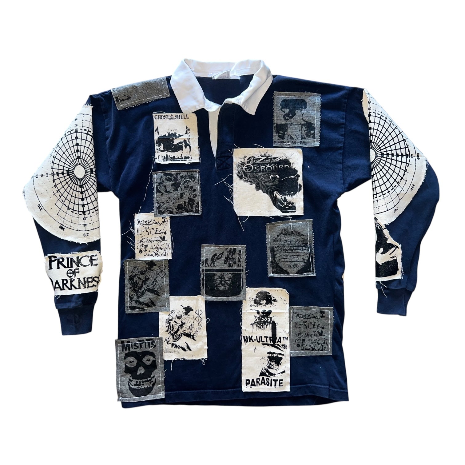 Made in Los Angeles, this Prince of Darkness Long sleeve Polo features horror, movie, band, and Ozzy patches, with a large exorcist patch on the back. Perfect for fans of horror and music, this polo offers style and comfort in size L. Unleash your dark side with this unique piece.