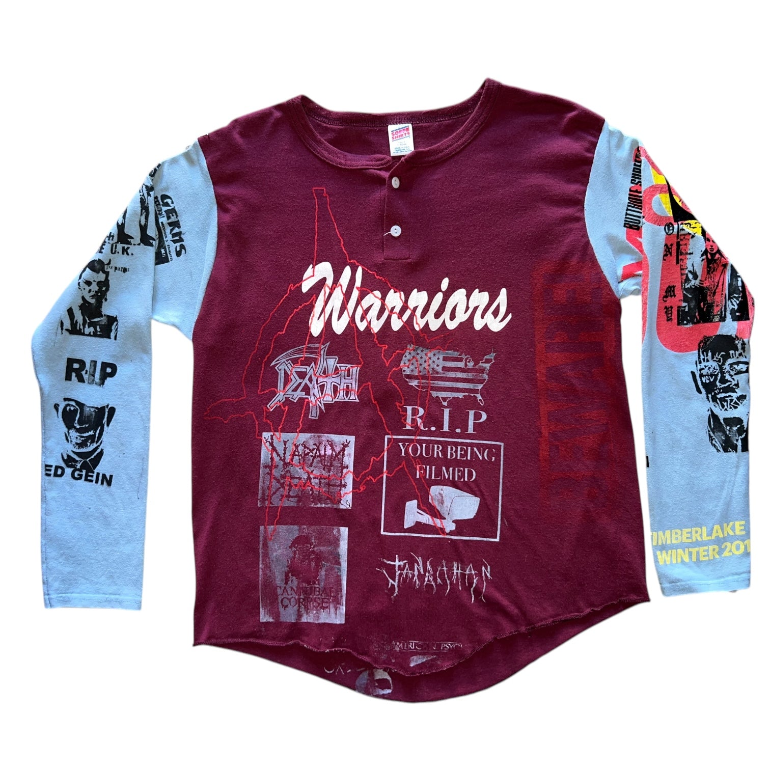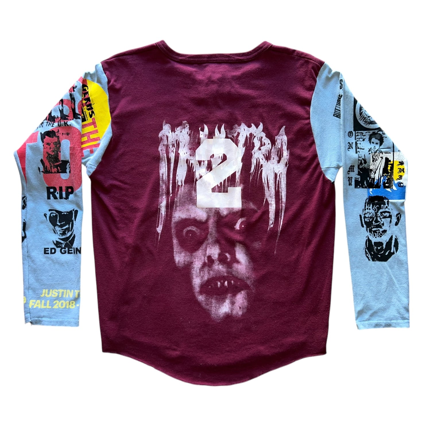 Introducing warriors reconstructed baseball long sleeve. Showcasing iconic prints including American psycho, porn star skate brand, cannibal corpse, death, napalm death, and ed gein, this burgundy and baby blue baseball style shirt is perfect for the fierce warrior in you. The back print features Pazuzu from the exorcist with a number 2 . Own your style and make a statement with this unique design.This item is one of one and will not be duplicated.